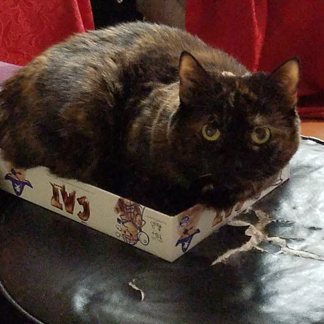 Carol's son gave us The Cat Game for Christmas. Carol opened the box and put the lid down. Smokey claimed it.