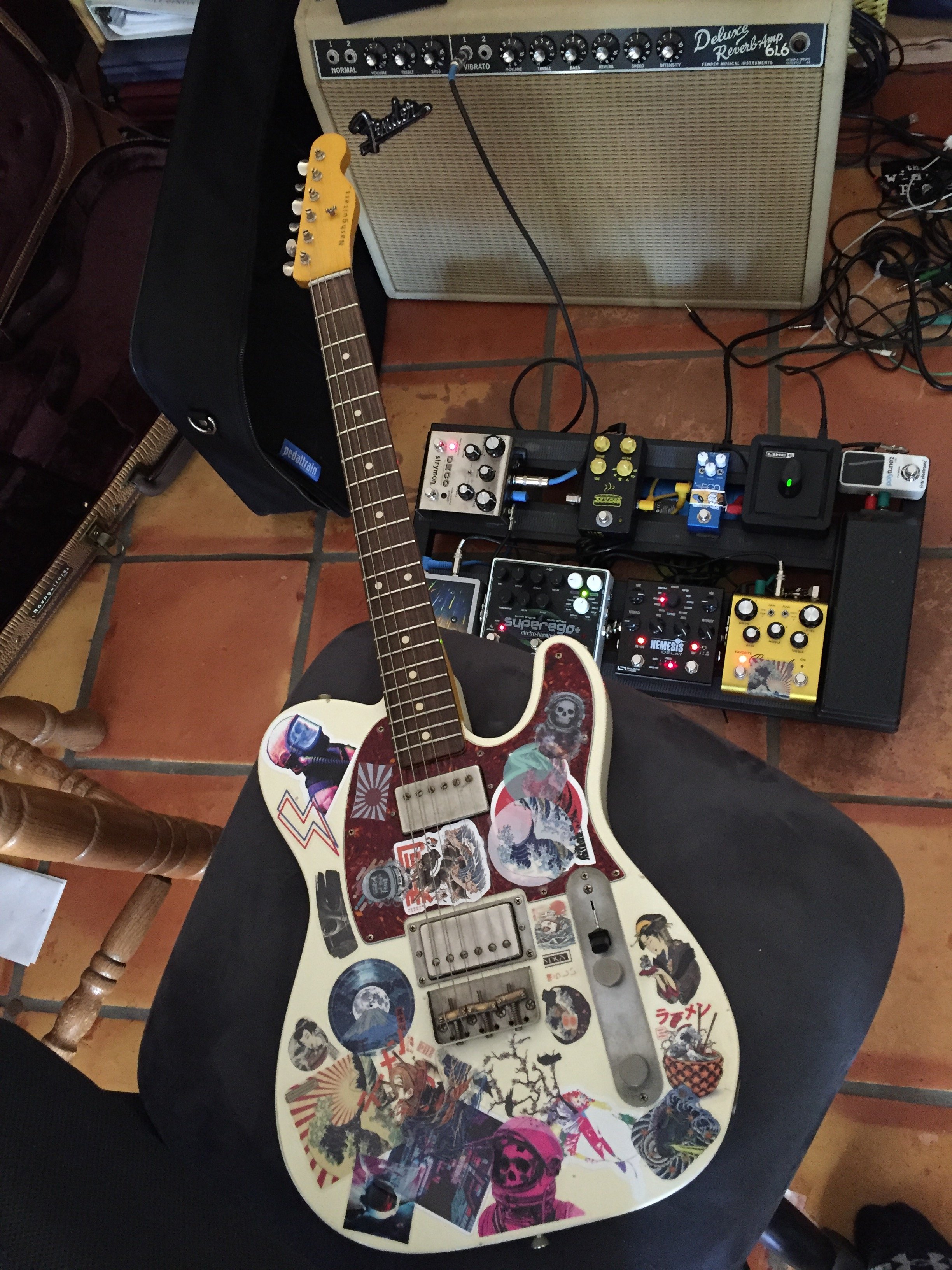 Version 11. The L6 wireless unit has an asinine shape and is purely a luxury but it’ll stay for now. I swapped the muffuletta for a Source Audio LA Lady. With the SA Neuro Hub and desktop editor, I can get all sorts of gain/OD/fuzz out of the LA Lady to compliment the Riverside. Stickers applied to shield retina flaming LEDs.